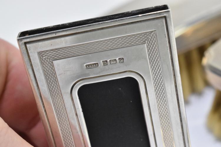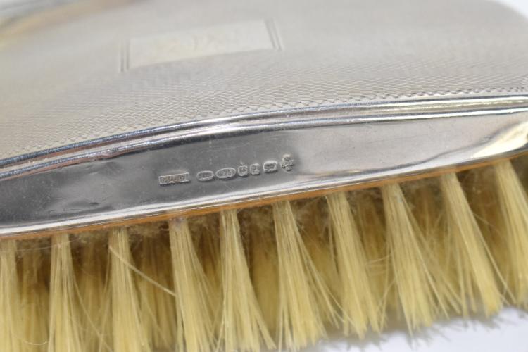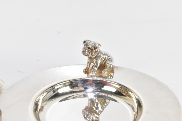 Lot 59 of 4047: H.C. FREEMAN; a hallmarked silver and enamel insurance emblem menu holder, for R.E.A 1720, Birmingham 1944, height 4.5cm, with a hallmarked silver dish modelled with a bulldog, a silver caddy spoon, a silver calling card case with presentation engraved verso 'From London and Edinburgh Insurance Group' and a silver pendant and chain, gross weight 6ozt/188g, and a pair of silver backed gentleman's brushes.