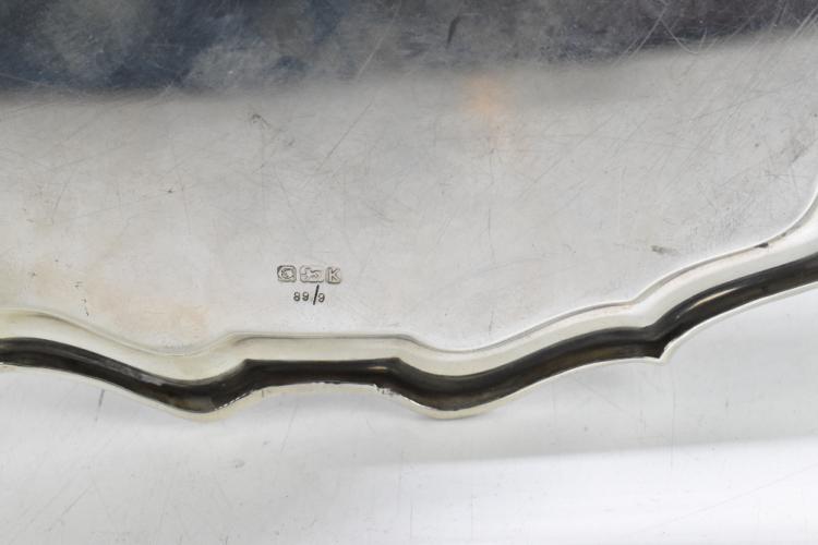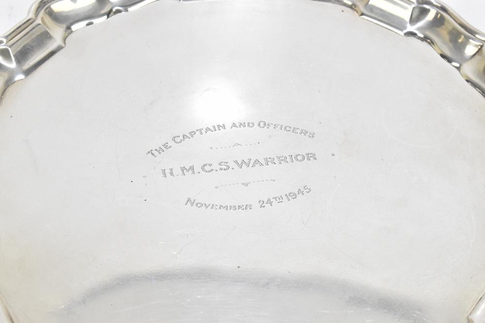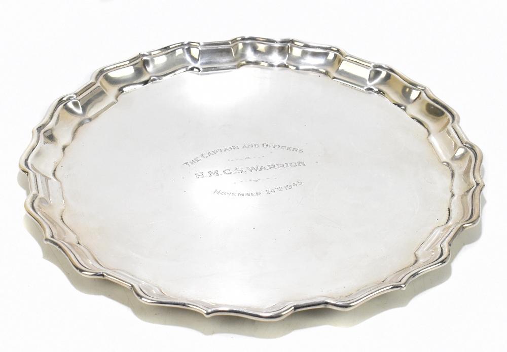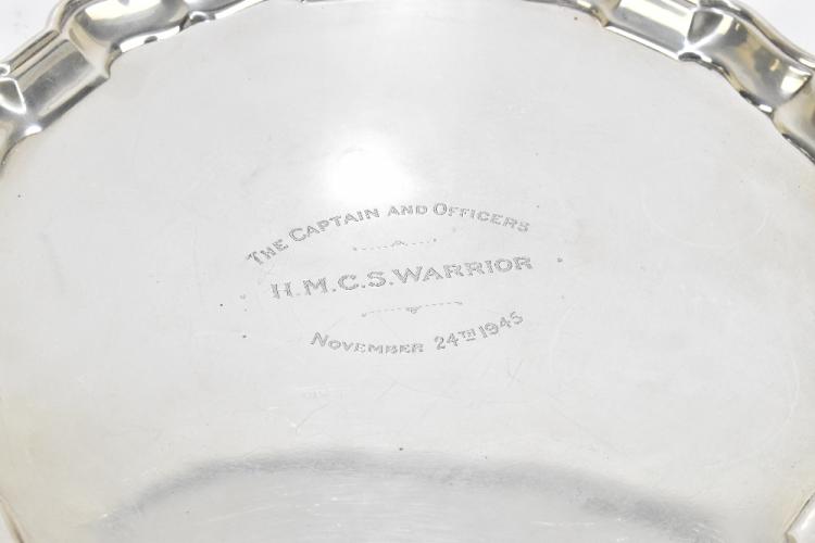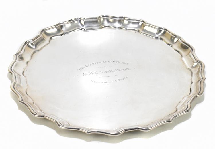 Lot 64 of 4047: BIRKS; a sterling silver salver, the centre engraved 'The Captain and Officers H.M.C.S Warrior November 24th 1945', 33.5ozt/1049g.
