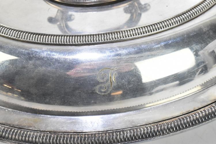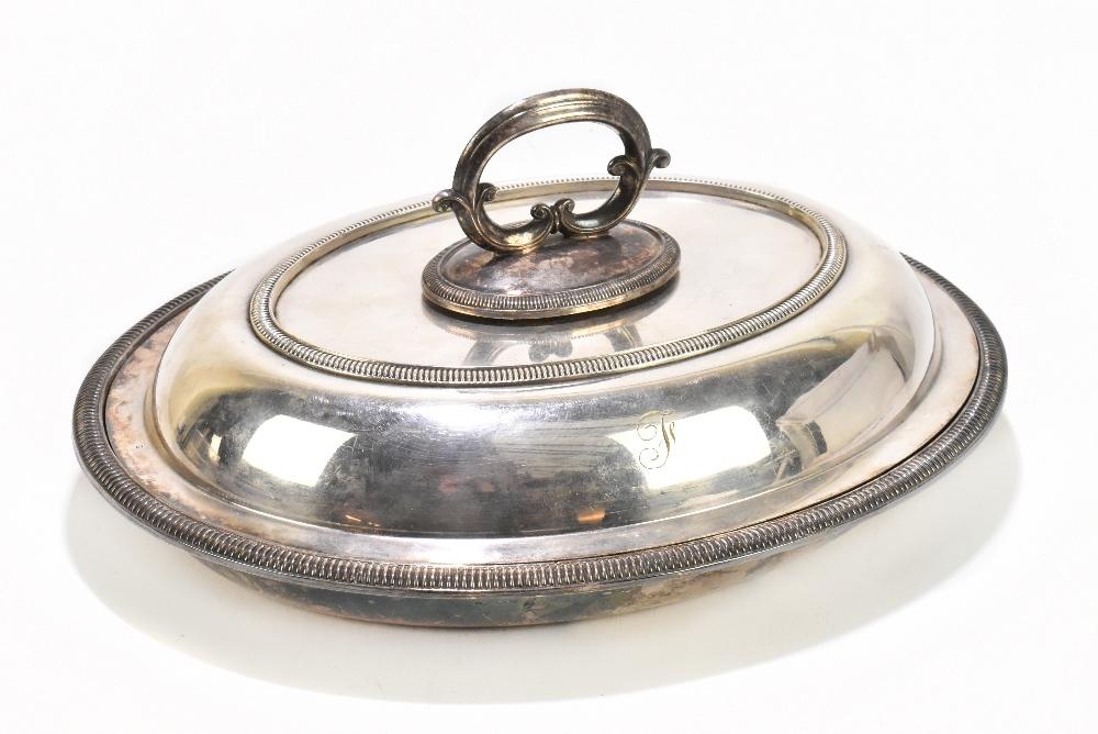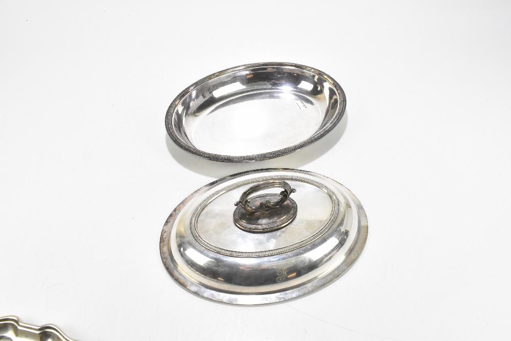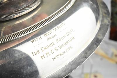 Lot 621 of 4047: MARITIME INTEREST; an oval silver plated entrée dish and cover, engraved 'With Best Wishes From The Engine Room Department H.M.C.S Warrior 24th November 1945'