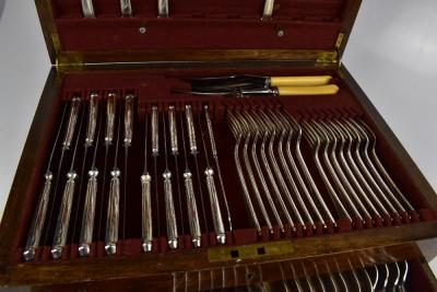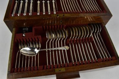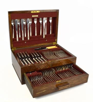 Lot 623 of 4047: ELKINGTON; a silver plate canteen of cutlery, in a walnut case.