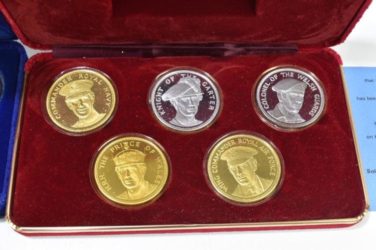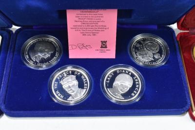 Lot 2028 of 4047: POBJOY; two commemorative silver coin sets comprising a boxed set of five coins commemorating the 30th birthday of the Prince of Wales, limited edition of 4000, and a set of four commemorating the wedding of Charles and Diana in 1981, with four hallmarked silver Pobjoy sweetheart dishes, each a limited edition of 250, gross weight of the dishes 7.2ozt/225g, Sheffield, 1977 (6)