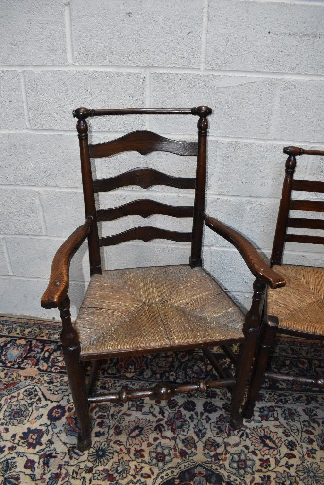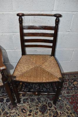 Lot 5698 of 4047: A harlequin set of 19th century and later Macclesfield oak ladder back chairs, with rush seats, including two with arms, (8)