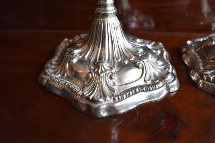 Lot 8 of 249: EBENEZER COKER; a pair of early George III hallmarked silver candlesticks, each with detachable sconce above baluster knopped stem to stylised shell embossed hexagonal bases, London 1765, height 27.5cm, combined approx. 41.72ozt/1297.6g (2). Provenance: The contents of a Cheshire Country House.