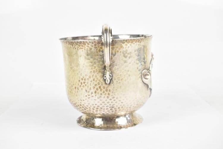 Lot 14 of 249: A late Victorian hallmarked beaten silver Arts & Crafts twin handled cup, with stylised central cartouche and spreading circular foot, the base engraved 'Sussex Goldsmiths Co Brighton', London 1900, length 18.5cm, approx 10.2ozt/317g.
