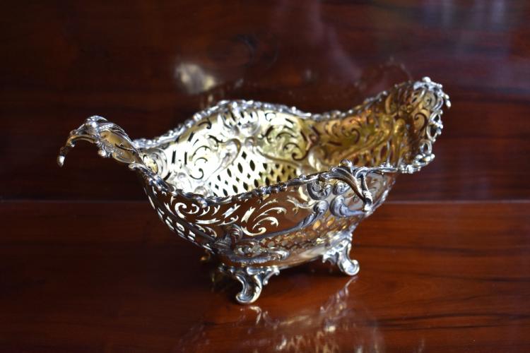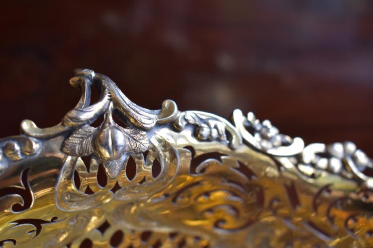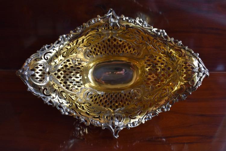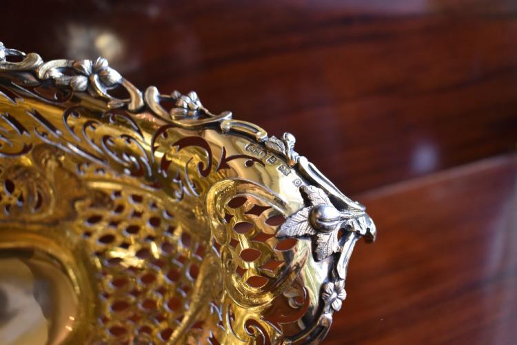 Lot 18 of 249: ELKINGTON & CO; a large Edwardian silver gilt pierced bowl with embossed and chased detail throguhout, Birmingham 1905, length 34cm, approx 22ozt/686g. Provenance: The contents of a Cheshire Country House.
