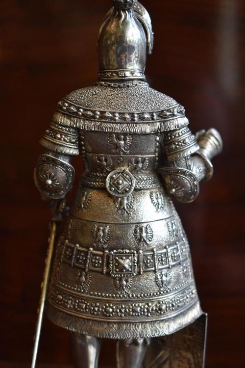 Lot 24 of 249: NERESHEIMER & CO OF HANAU; two similar early 20th century silver figures of knights, each with carved ivory face, holding swords in their left hands and raised on pierced stepped bases, one with import marks for Berthold Muller, London 1922, heights 24 and 22.5cm (2). APHA reference 25NC42UC Provenance: The contents of a Cheshire Country House.