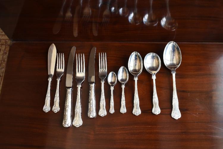Lot 40 of 249: A comprehensive suite of contemporary silver plated and stainless steel cutlery comprising fifteen fish knives, eleven small knives, fifteen large knives, fifteen fish forks, fifteen large forks, twelve small forks, fifteen small teaspoons, twenty-two large teaspoons, fifteen large spoons, fifteen soup spoons and six serving spoons, also a set of six contemporary silver plated bottle coasters, various plate coasters, glass coasters, napkin rings, etc. Provenance: The contents of a Cheshire Cou