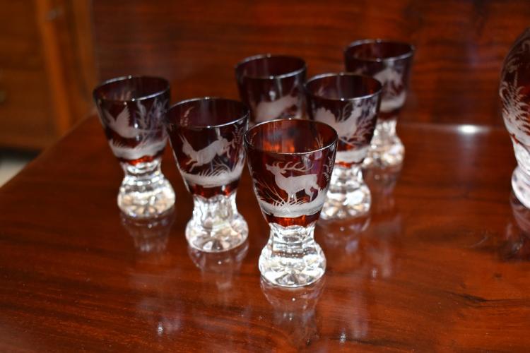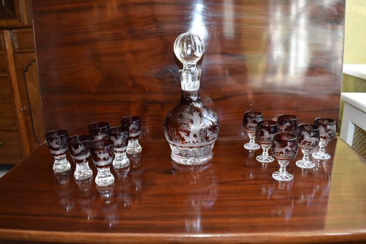 Lot 45 of 249: An early 20th century cut glass ruby tinted liqueur set comprising a decanter with substantial stopper above globular body showing a huntsman with gun raised and two hounds by his feet, sold with two sets of six Bohemian ruby tinted liqueur glasses, one set engraved with horses in various poses, the second engraved with game, depicting duck, hare, stag, pheasant, boar and deer, height of decanter 25.5cm, heights of glasses 8cm and 7.75cm. Provenance: The contents of a Cheshire Country House.