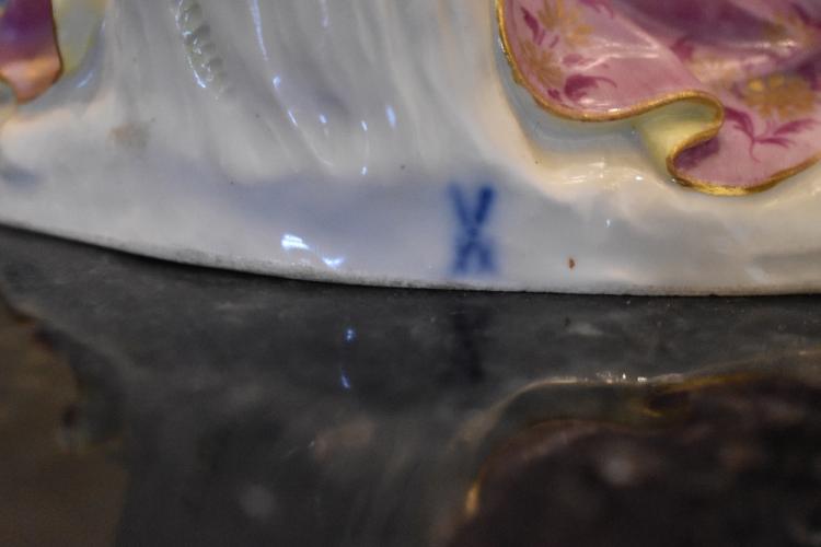 Lot 47 of 249: An early 19th century Meissen porcelain figure group of Harlequin and Columbine after the original model by J.J.Kaendler, the figures beside a tree with bird perched upon a branch, painted blue crossed swords mark to back of figure, also incised number 782 and impressed number 1470 to base, height 19.5cm, width approx. 15cm. Provenance: The contents of a Cheshire Country House.