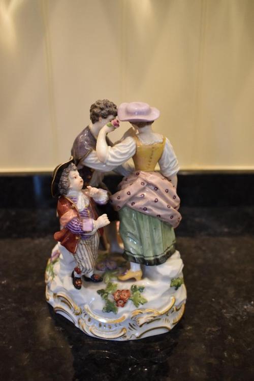 Lot 48 of 249: A late 19th century Meissen porcelain figure group of male and female gardeners with a boy by their side, on a scrolling gilt heightened base, painted blue crossed swords marks to base, incised mark B28 and impressed numbers 48, height 18cm. Provenance: The contents of a Cheshire Country House.