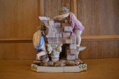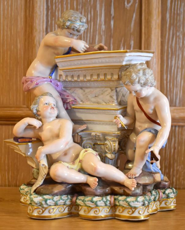 Lot 51 of 249: A mid-19th century Meissen porcelain figure group representing Architecture, with three cherubic figures beside a marble stepped ruin, painted blue crossed sword marks to base with incised number and possible scratch through beneath the mark, height 22cm. Provenance: The contents of a Cheshire Country House.