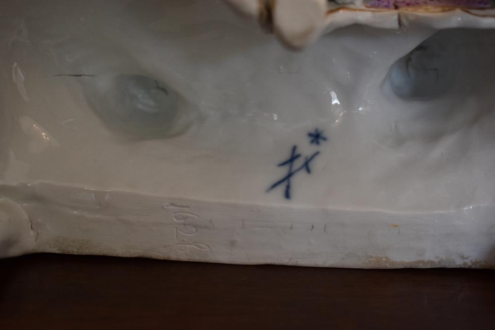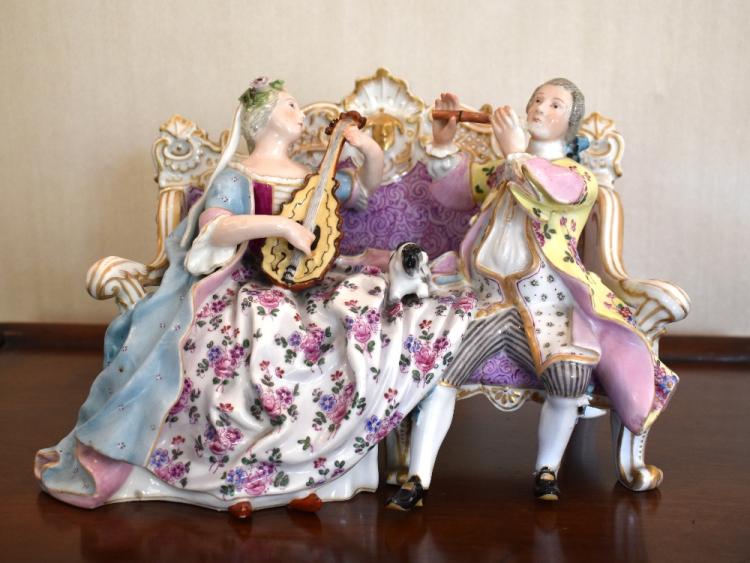 Lot 52 of 249: A Meissen Marcolini period porcelain group of a couple seated on an elaborate settee, playing musical instruments, with dog between them, painted blue crossed swords marks to base, also incised number 1628, width 23.5cm. Provenance: The contents of a Cheshire Country House.