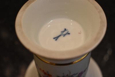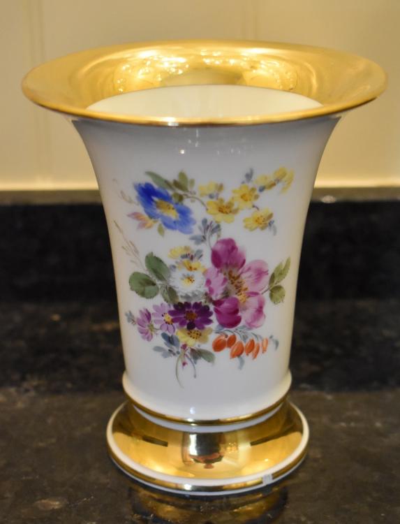 Lot 55 of 249: A late 20th century Meissen trumpet vase painted with floral sprays and broad gilt bands, height 13.75cm, painted blue crossed swords mark to base, with indistinct painted number beside and impressed number, possibly 8228, although this is a little unclear. Provenance: The contents of a Cheshire Country House.