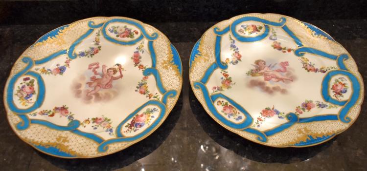 Lot 60 of 249: A pair of 19th century Sèvres cabinet plates with bleu celeste and gilt heightened border, floral garlands and each centred with a cherub, painted mark to the reverse, diameter 24cm (2). Provenance: The contents of a Cheshire Country House.