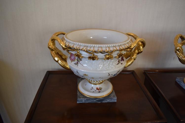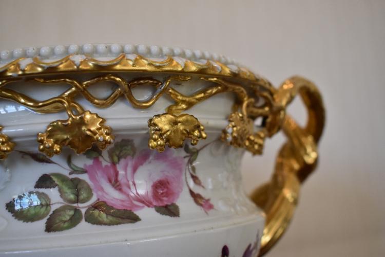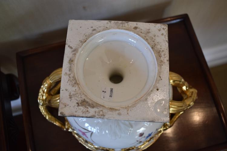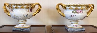 Lot 65 of 249: A pair of early 19th century Derby 'Warwick Vases', both with gilt heightened detail and pierced scrolling handles, with both relief moulded and hand painted floral detail to the bodies, on simulated grey marble bases, unmarked, c.1820, height 22.5cm, width 32.5cm (2). Provenance: The contents of a Cheshire Country House.
