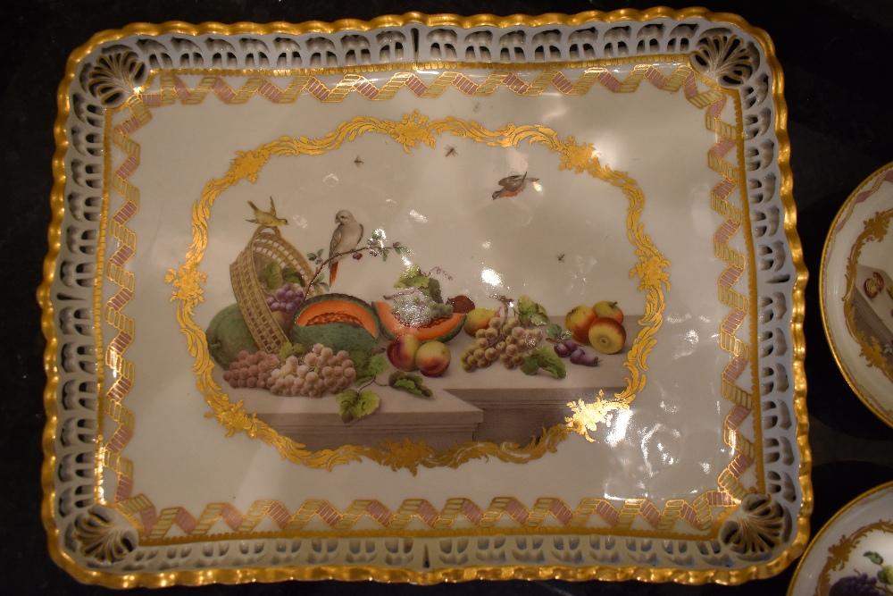 Lot 67 of 249: A 19th century Vienna Porcelain rounded rectangular porcelain tray with reticulated gallery and central panel painted with birds, insects and a shelf of fruit, 32.5 x 24.5cm, the matching lidded jug similarly decorated and with cover and a matching pair of cups and saucers, diameter of saucers 13.5cm. Provenance: The contents of a Cheshire Country House.