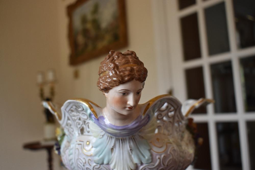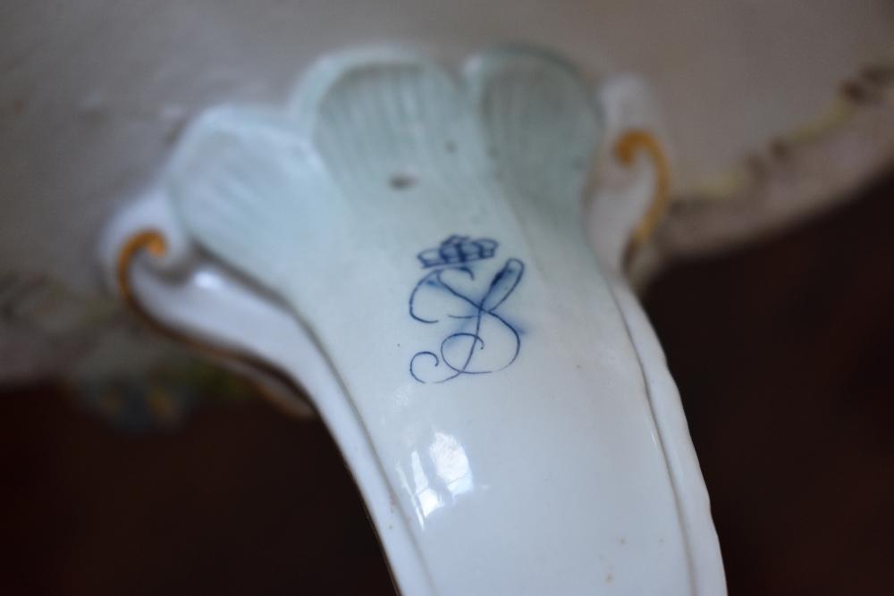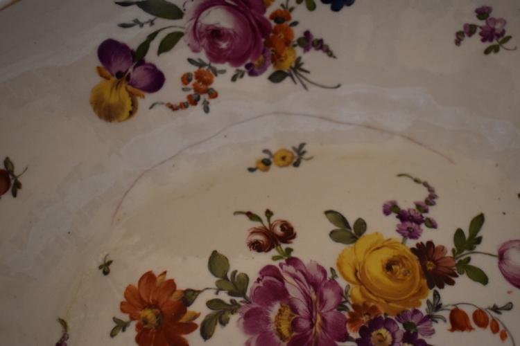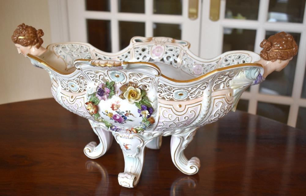 Lot 73 of 249: A large circa 1900 Continental porcelain centrepiece with pierced shaped rim, twin female mask ends and hand painted throughout with floral sprays within an applied floral encrusted garland to both sides, raised on four scrolling supports, length 53.5cm, width 33cm, height 29cm. Provenance: The contents of a Cheshire Country House.