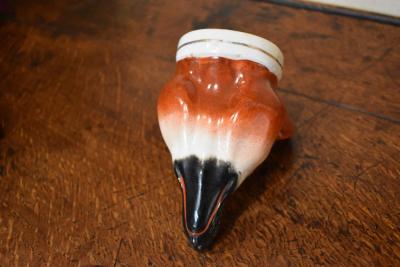 Lot 80 of 249: A 19th century Pratt type fox head stirrup cup with painted detail, unmarked, length 13cm. Provenance: The contents of a Cheshire Country House.