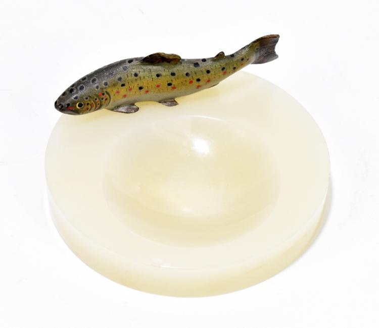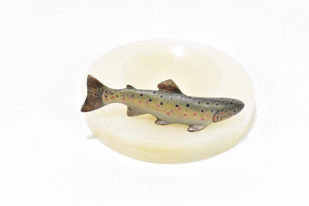 Lot 85 of 249: A 1930s polished white onyx pin dish surmounted with a cold painted bronze salmon, diameter 12cm. Provenance: The contents of a Cheshire Country House.