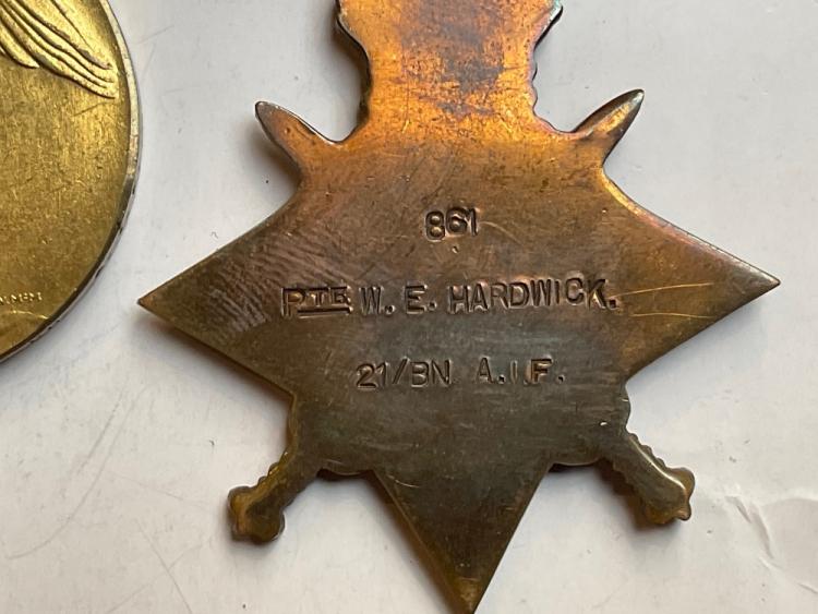 Lot 14 of 2140: A WWI Australian Imperial Force Military Cross and bar group of four, the MC engraved 'Presented by the King 6/6/17 to LT W.E Hardwick for bravery in the field', the BWM and VM engraved 'Lieut W.E Hardwick AIF', the VM also engraved '21-BN', the 1914-15 Star numbered 861, the Victory Medal with mentioned in despatches oak leaf, sold with a photograph of William Emelyn Hardwick in military uniform, a mentioned in despatches certificate and a folder of printed documents and ephemera including a fa