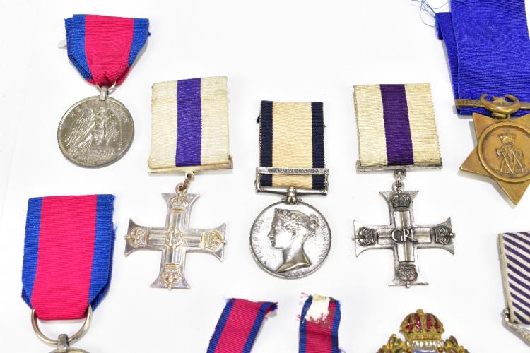 Lot 40 of 2140: A selection of medals and copy medals, comprising a Military Cross dated 1945, a copy of a Military Cross, a copy of a Distinguished Flying Medal, a Trafalgar medal (probably a copy), a Khedive Star, a copy of a South Atlantic medal, two further replica Waterloo medals, two miniature Waterloo medals, an enamelled Waterloo badge and a further medal.