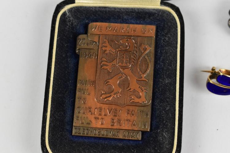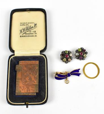 Lot 60 of 2140: A cased WWII army badge, also a yellow metal and blue enamel brooch and a pair of clip-on earrings.