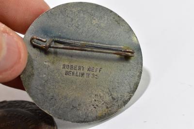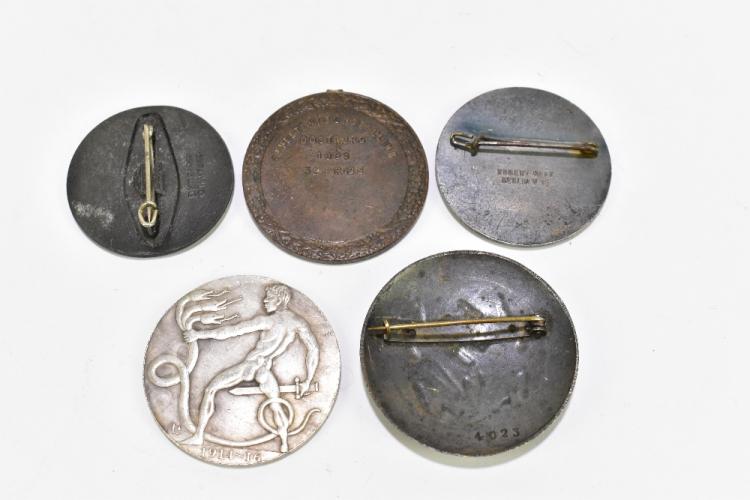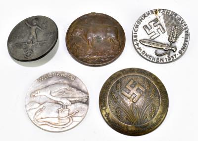Lot 61 of 2140: A group of five German military service badges, including a NSDAP badge, a 1914- Weitkrieg badge, a 1939 3rd prize medal embossed with a bull, a 1937 badge and a German Women's Labour Service brooch (5).