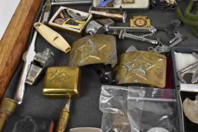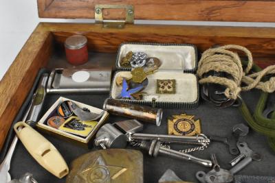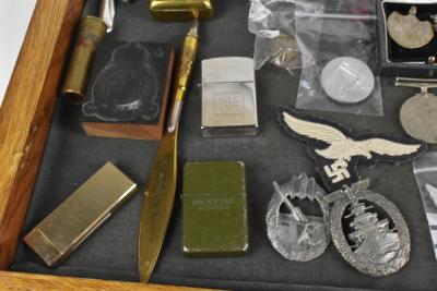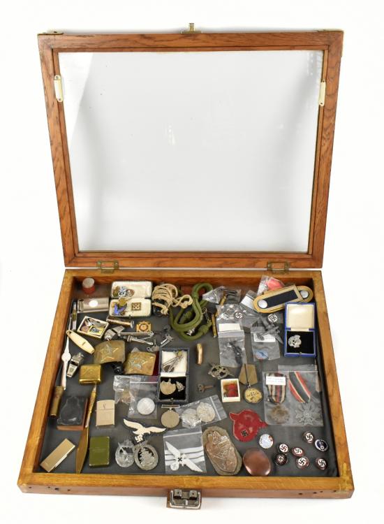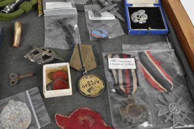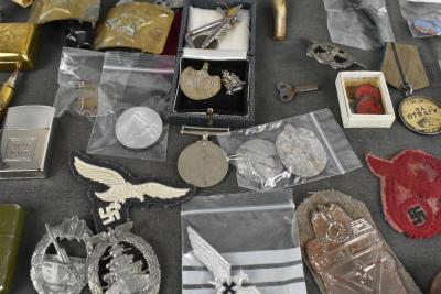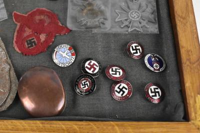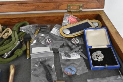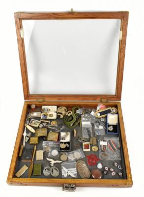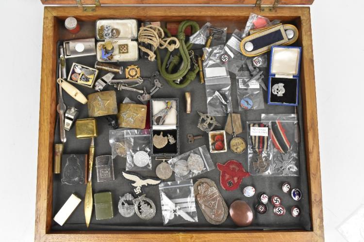 Lot 70 of 2140: A large collection of militaria including medals, badges, whistles, etc, including Third Reich enamel badges, etc, contained in a bijouterie case.
