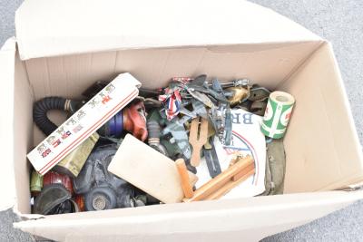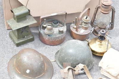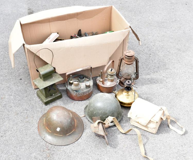 Lot 86 of 2140: An assortment of military items including an ARP-type helmet, a later American composite helmet, a green signal lamp, other lamps and vintage items, gasmasks, etc.