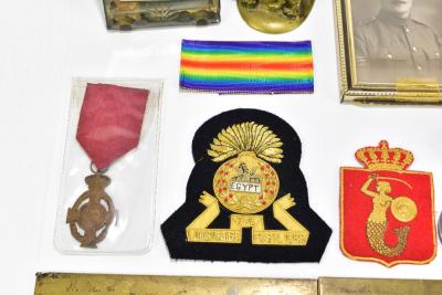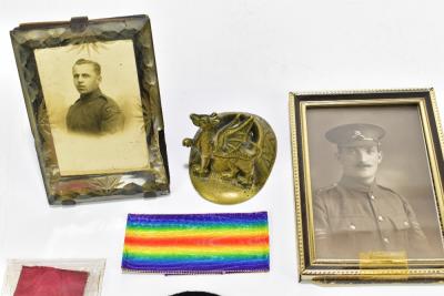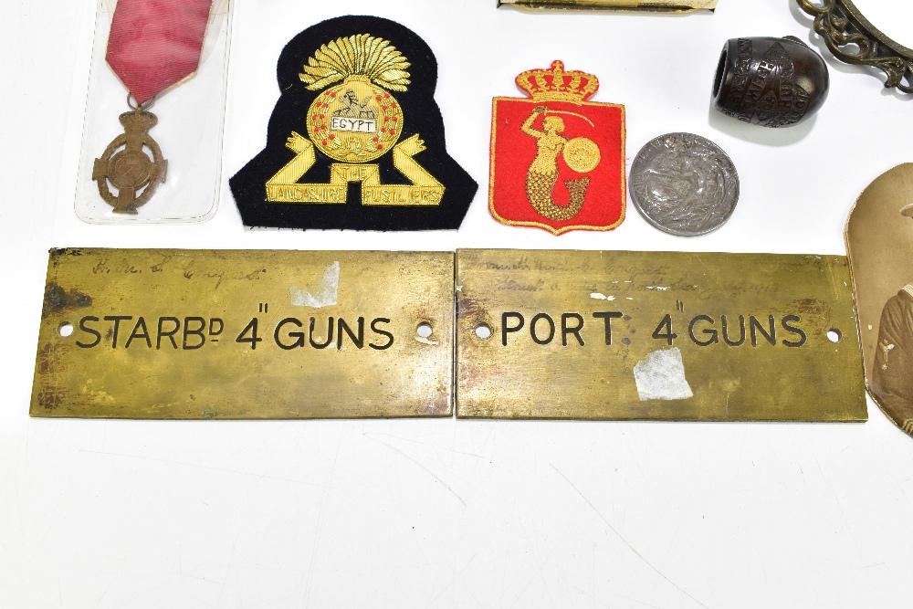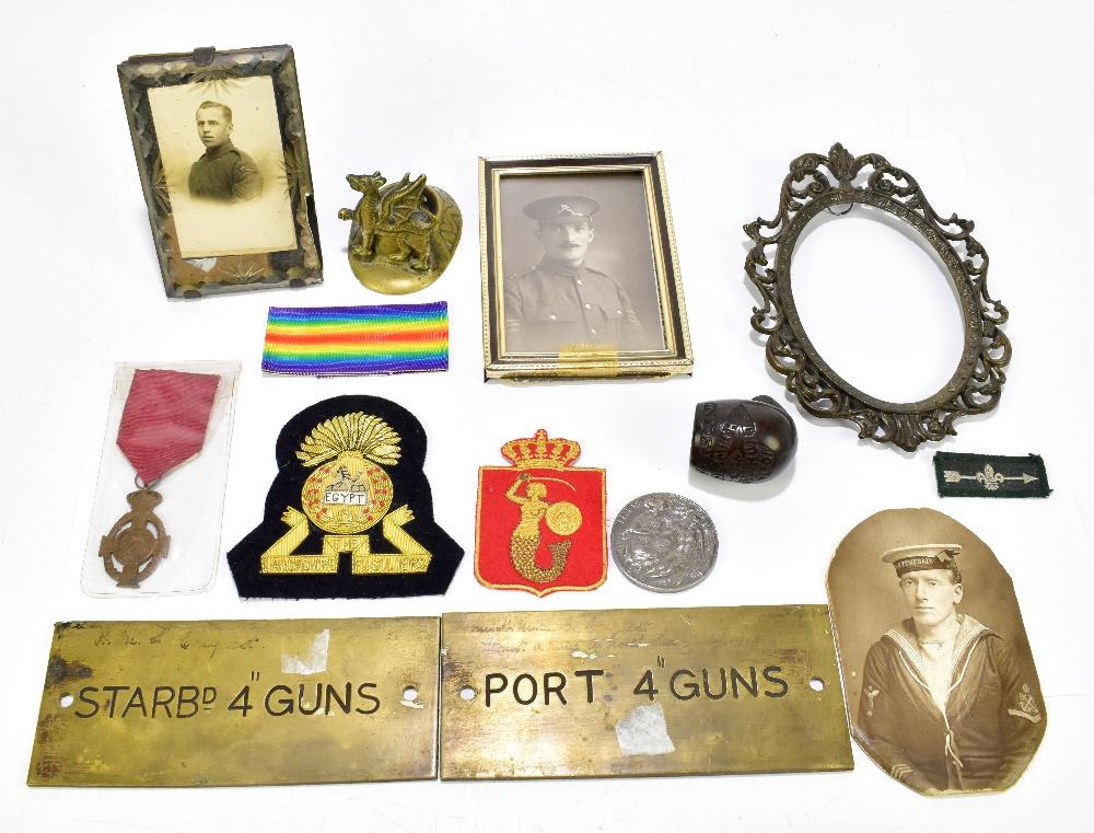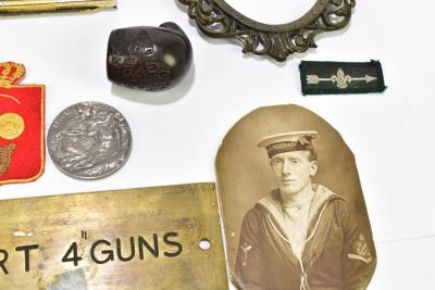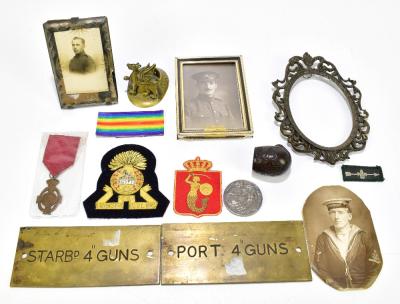 Lot 90 of 2140: WWI INTEREST; a black and white photograph of a soldier wearing a Royal Flying Corps uniform, a miniature silver plated memorial plaque, uninscribed, with printed signature A. Drupy, diameter 4.5cm, part of a pipe dated 1907, a Trench Art ashtray, various photographs, two bronze door plates for Port 4" guns and Starboard 4" guns.