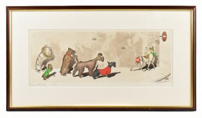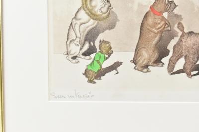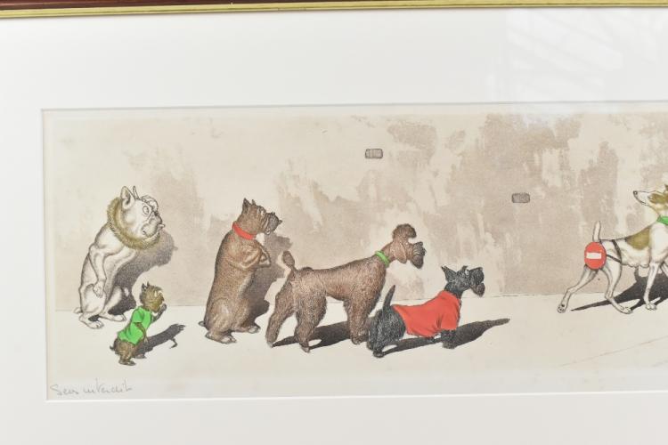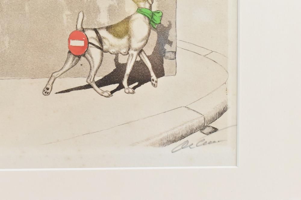 Lot 557 of 2140: BORIS O'KLEIN; colour print, 'The Dirty Dogs of Paris', signed and titled in pencil, 18 x 44.5cm, framed.