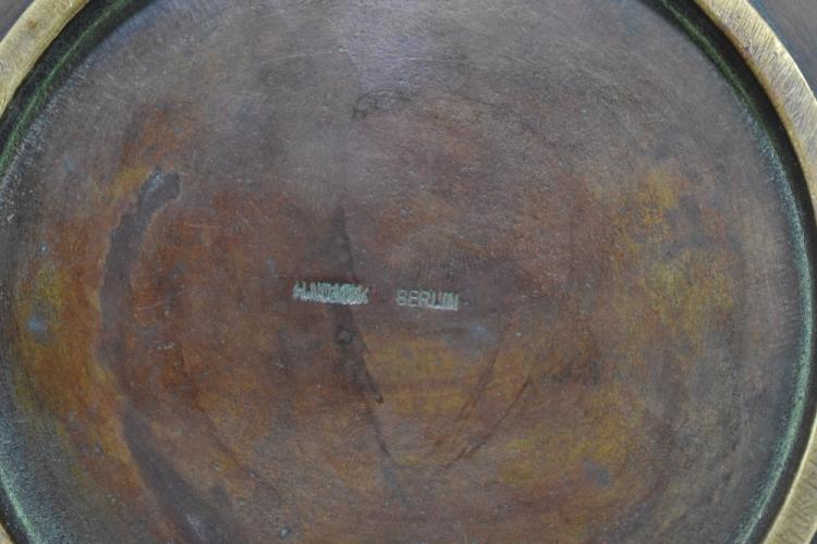 Lot 1211 of 2140: HERMANN NOACK; a German bronze commemorative plate centred with impressed and relief decoration of Sarotti chocolate figure, inscribed to outer edge 'Rudolf Funcke als ehrende anerkennung fur 25-Jahrige treue tatigket sarotti aktien gesells chaft', (for 25 years loyal service), impressed marks verso, diameter 20cm.