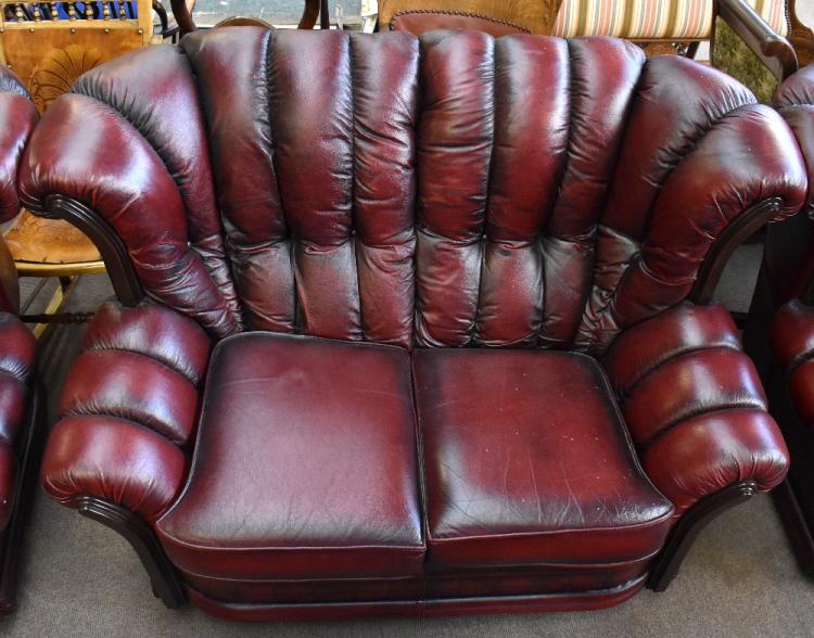 Lot 2376 of 2140: A modern maroon leather three piece suite with mahogany effect arms and button backs, comprising a three seater sofa, a two seater sofa with armchair and matching stool (4).