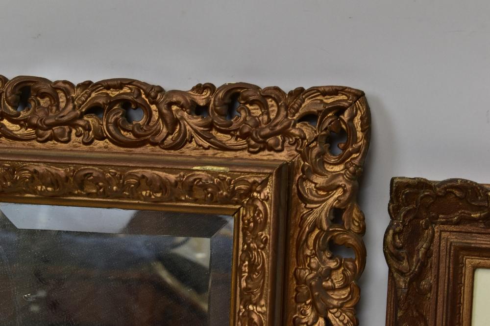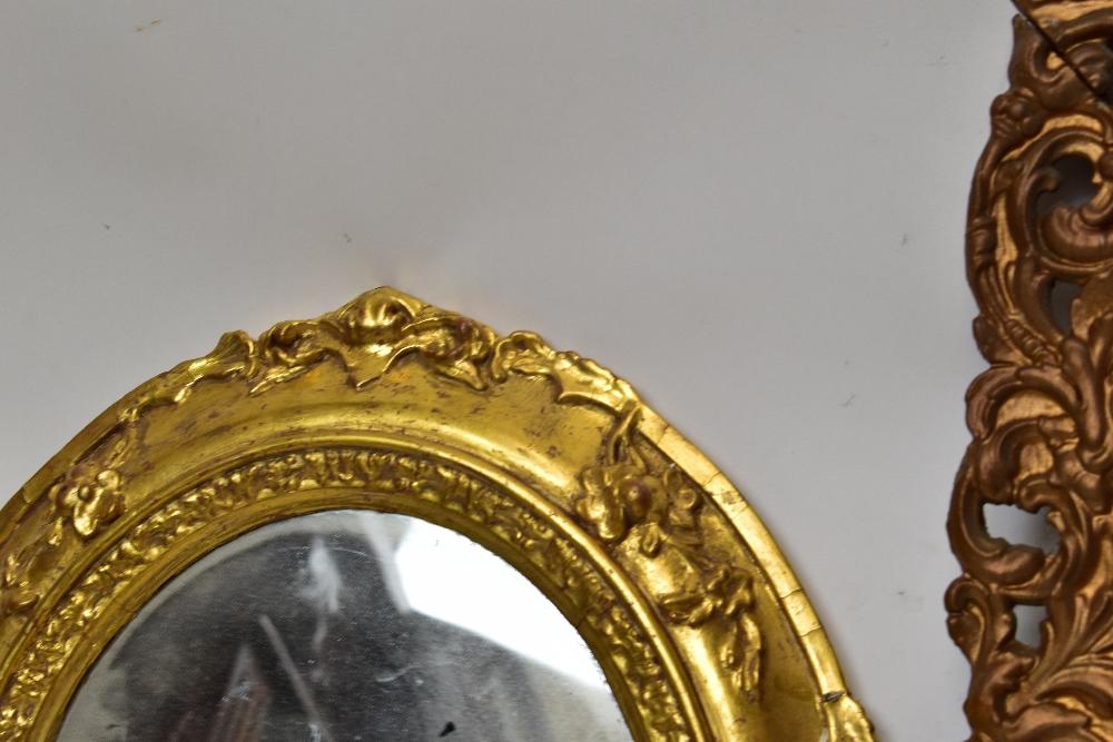 Lot 2382 of 2140: A 19th century gilt wood and gesso oval wall mirror with foliate frame, 48 x 42cm, a rectangular wall mirror, and a watercolour of a country scene with a cottage (3).