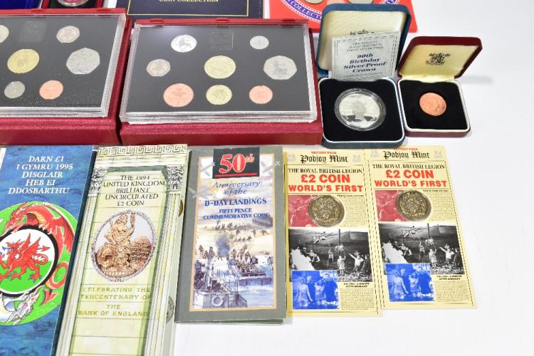 Lot 30A of 2140: An assortment of British coinage, including Royal Mint proof sets, silver proof crown produced to commemorate Her majesty Queen Elizabeth The Queen Mother 90th birthday, 1992-1993 silver proof fifty pence coin, etc.