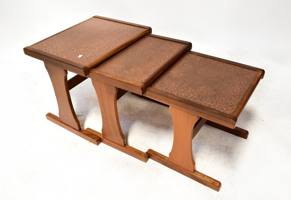 Lot 57 of 854: E GOMME LTD OF LONDON FOR G-PLAN; a vintage retro teak framed nest of tables, each with inset beaten copper panel to the top, 47.5 x 53 x 43cm.