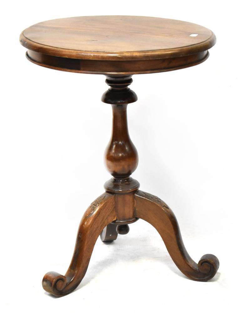 Lot 70 of 854: A reproduction mahogany circular occasional table on turned baluster column, to three outswept scrolling supports with carved floral detail, 65 x 49cm.
