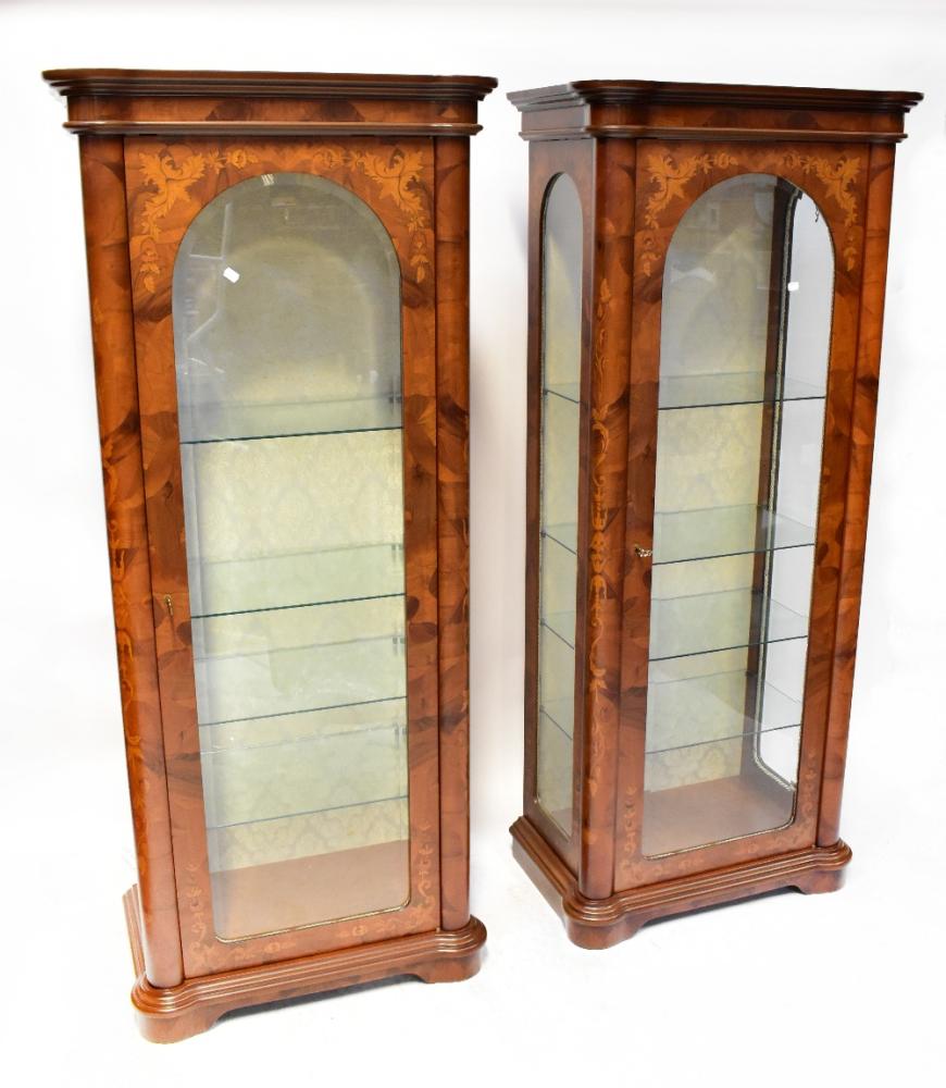 Lot 75 of 854: A pair of contemporary Italian Sorrento marquetry inlaid burr walnut vitrines, the moulded top above single arched glazed door flanked by pair of pilasters, raised on bracket feet, 181 x 77 x 46cm (2).
