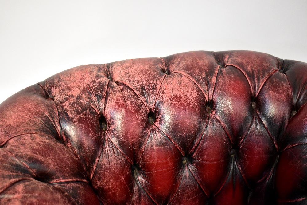 Lot 80 of 854: A three-seat Chesterfield settee, button back and upholstered in oxblood leather, width 209cm, and a matching armchair, width 108cm, both with leather studs and on bun feet (2).