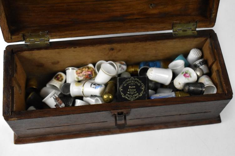 Lot 500 of 854: An inlaid wooden lidded box containing various sewing items, threads, needles, yarns, accessories, etc, a square oak biscuit barrel containing buttons, etc and a wooden box containing various thimbles including silver examples (3).