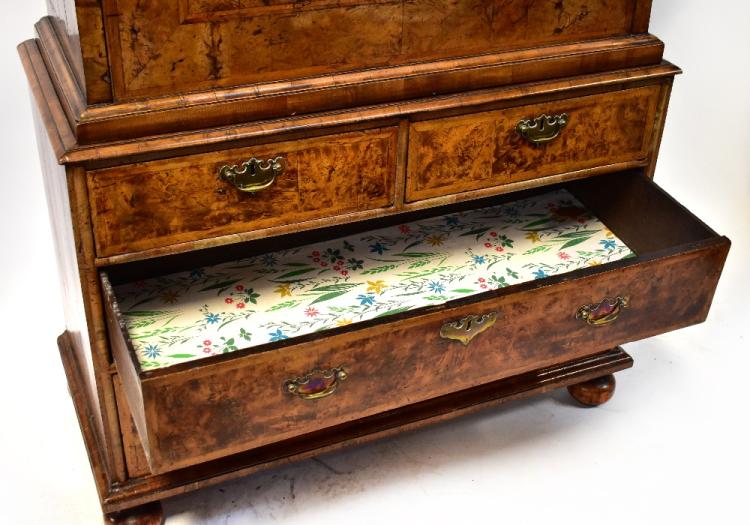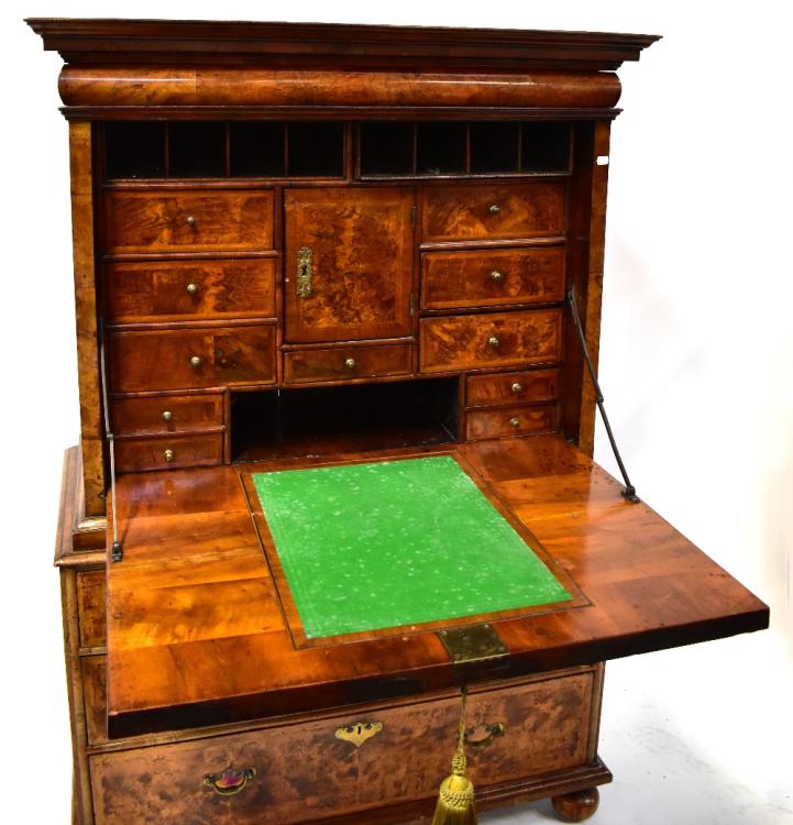 Lot 1 of 1095: A late 17th/early 18th century burr walnut escritoire with fall-front revealing a fitted interior of pigeonholes and drawers around a central cupboard door, on a base of two short and two long drawers, on bun feet, 172 x 114 x 53cm.