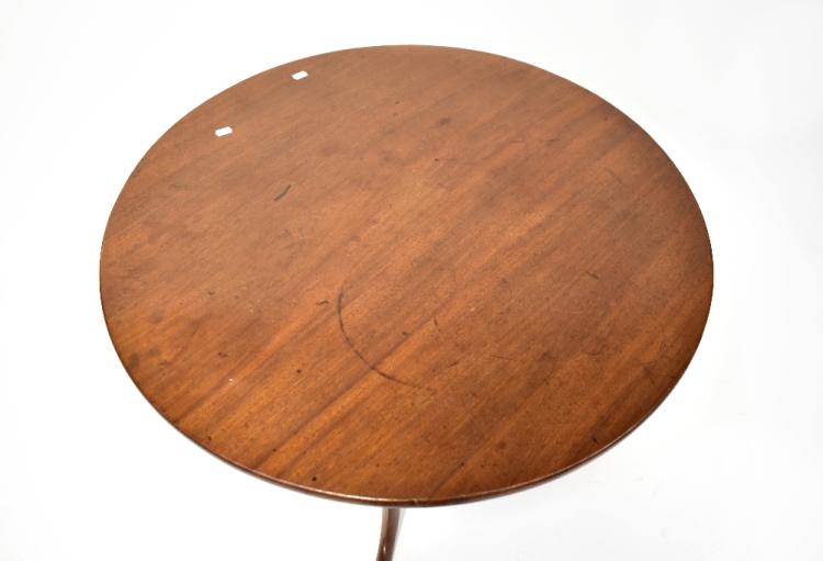 Lot 4 of 1095: A George III mahogany circular tilt-top occasional table raised on turned central column to three outswept supports, 71 x 85cm.