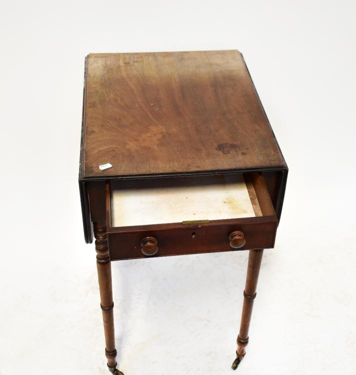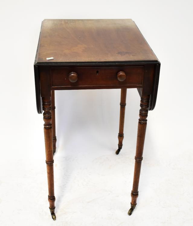 Lot 15 of 1095: A 19th century mahogany Pembroke table with single frieze drawer, with turned wooden handles, on ring turned tapering legs with castors, 76 x 89 x 53.5cm.