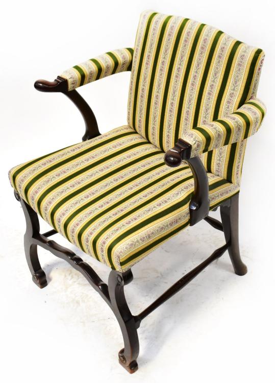 Lot 27 of 1095: A 19th century mahogany parlour chair, upholstered in a green, yellow and cream floral striped material, with open arms and scroll ends, on a base with serpentine legs united by shaped stretchers, height 91cm.