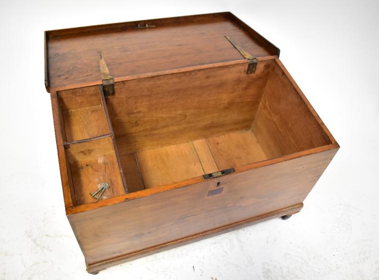 Lot 31 of 1095: A 19th century stained wooden chest with iron drop handles, the lift-up top enclosing an interior with candle shelf, the whole on later castors, 56 x 93 x 51cm.