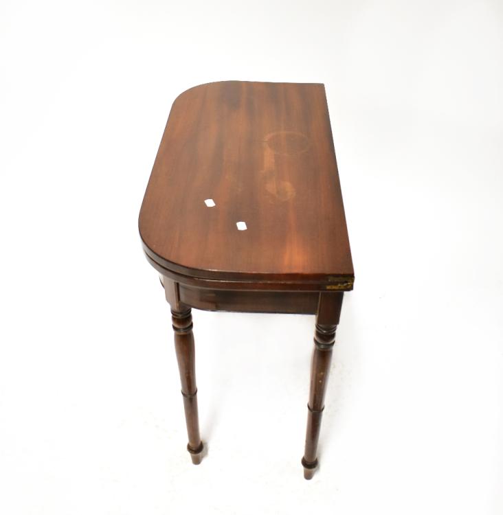 Lot 35 of 1095: A Victorian mahogany fold-over tea table with simple frieze and raised on turned supports, 75 x 86 x 43cm (af).