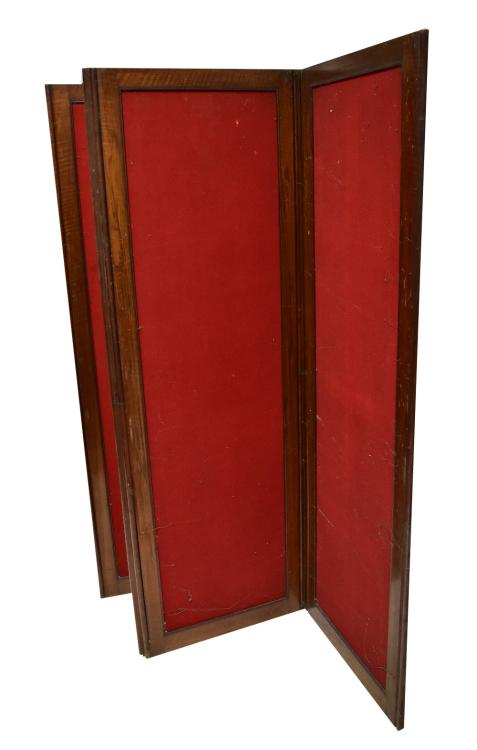Lot 38 of 1095: A late 19th century mahogany four-panel screen, each panel upholstered with a red felt material, within plain frames, each panel 198 x 64cm.