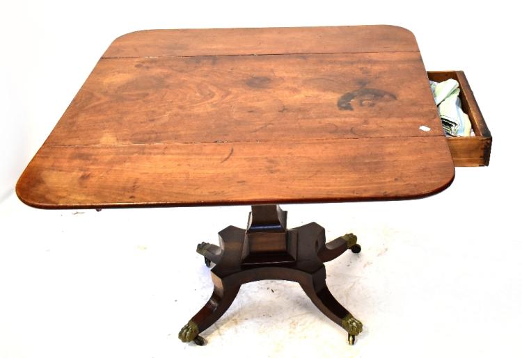 Lot 43 of 1095: A Regency mahogany Pembroke table with D-end leaves above a single frieze drawer, on a square tapered column and a quadripartite base with outswept legs terminating in brass lion paw feet and castors, height 72cm, length 92cm.