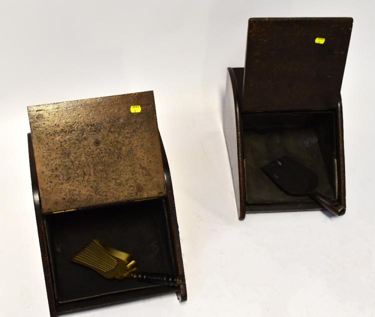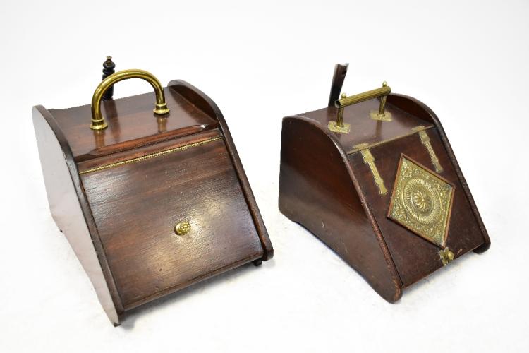 Lot 46 of 1095: Two late 19th century mahogany coal scuttles with brass handles, knobs and embellishments, both with inner liners and coal scoops (2).