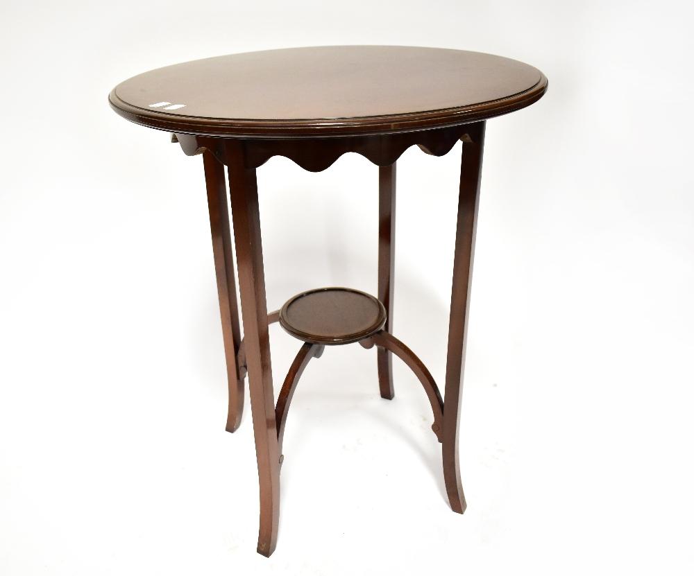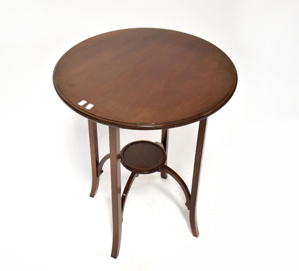 Lot 51 of 1095: An Edwardian mahogany circular occasional table with simple frieze, raised on square section outswept supports united by a dished undertier, height 72.5cm, diameter 61cm.